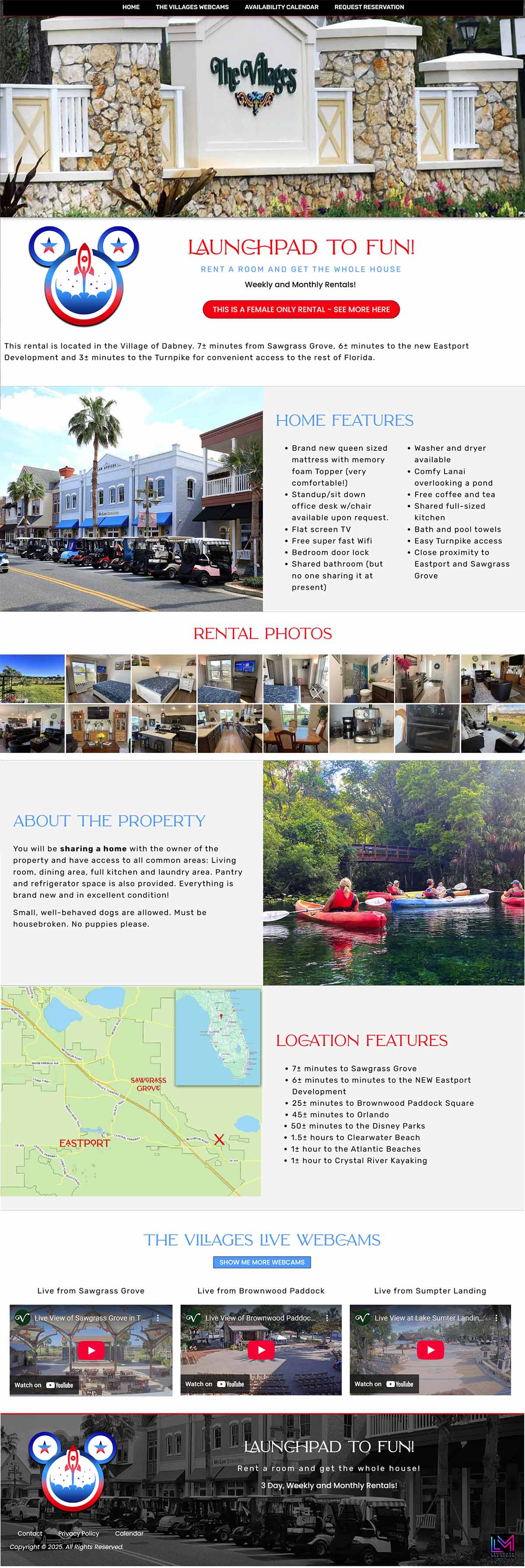A clean, modern website designed to showcase a premier vacation rental in The Villages, Florida. Featuring a vibrant color palette, creative logo and an accurate photo gallery that highlights the property’s best features. This site includes a simple availability calendar, detailed map illustrating proximity to Eastport – The Villages’ most popular development yet – and embedded YouTube Live feeds from town squares for an authentic local vibe. Plus, a streamlined, fully functional registration form ensures a seamless booking experience.